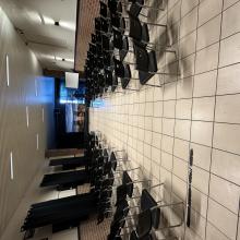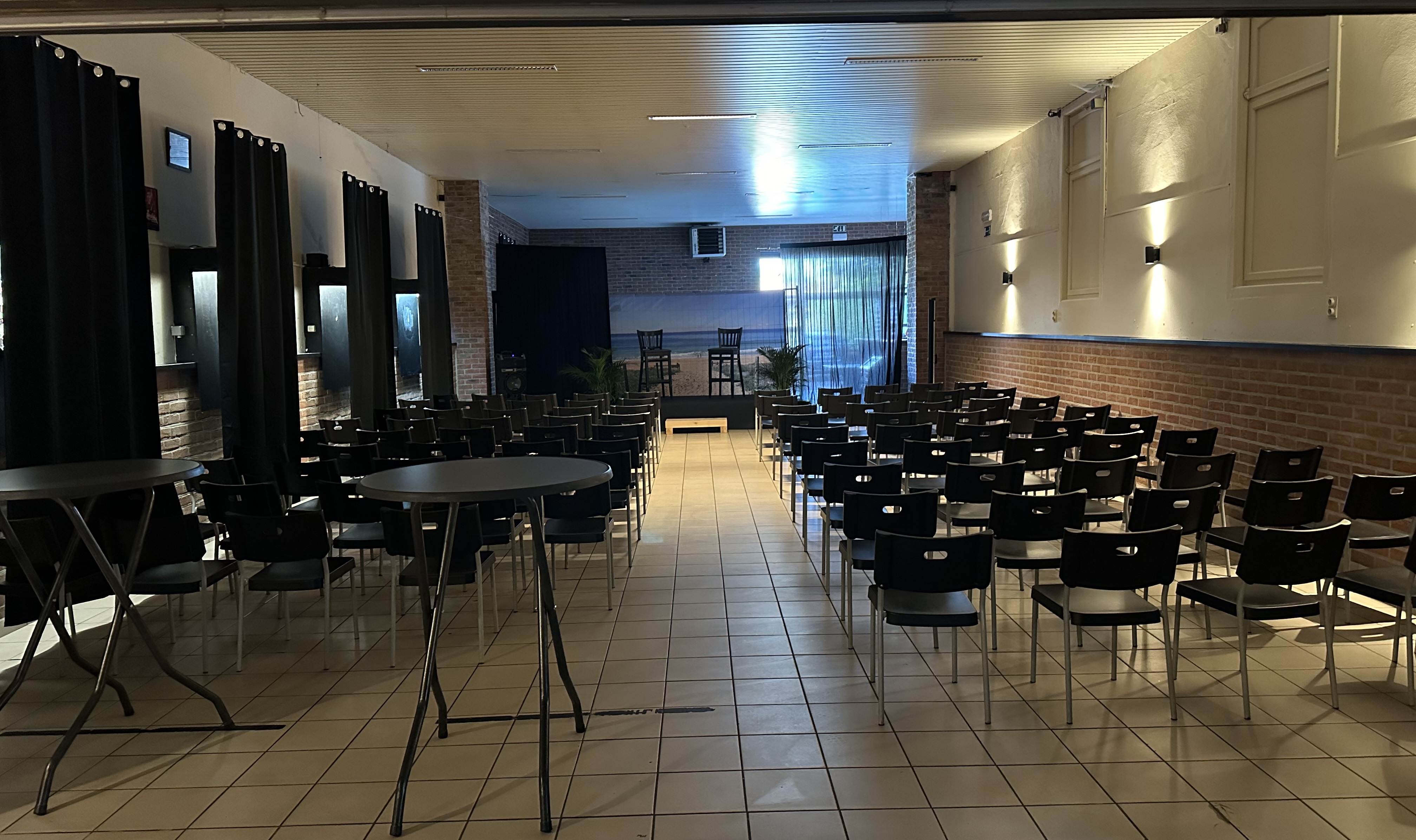 De zaal is voorzien van een podium, wat het een uitstekende keuze maakt voor sprekers, muziekoptredens of andere presentaties. Dankzij de directe aansluiting met het café is er een ruime keuze aan dranken beschikbaar, en het bedienend personeel zorgt ervoor dat uw gasten niets tekortkomen. Voor privégelegenheden kan de zaal volledig worden afgesloten van het café, waardoor u in alle rust en privacy kunt genieten van uw evenement.