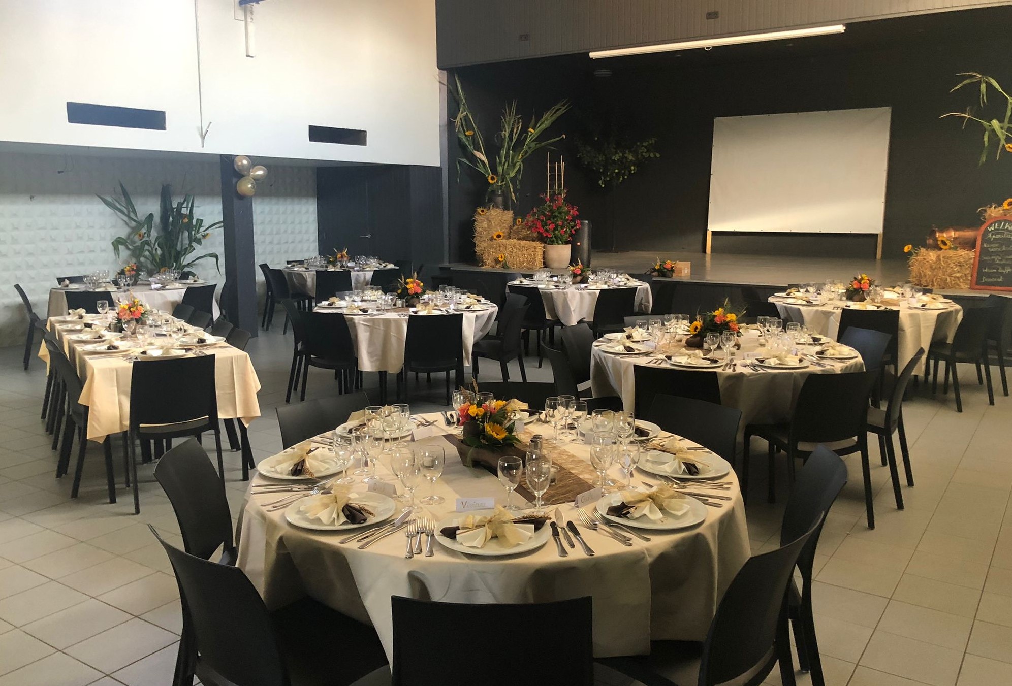 - Max. aantal personen aan tafel voor eetfestijnen: 170 p. (met podium) of 144 p. (zonder podium).