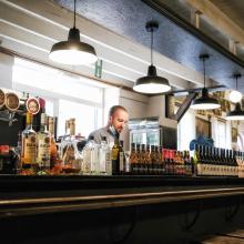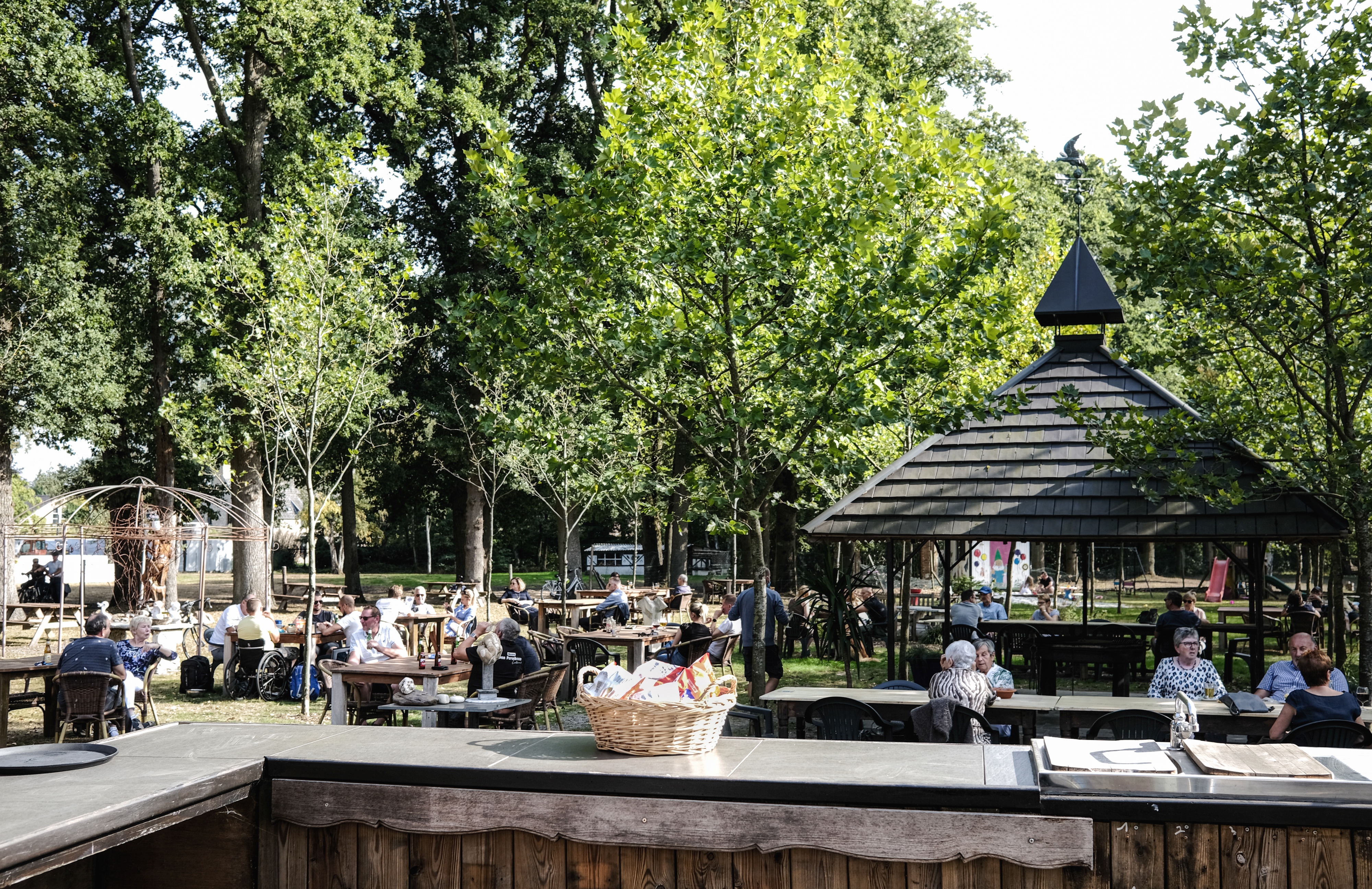 Buitenbar met terras, overdekt en open (150 zitplaatsen) met zicht op weide.