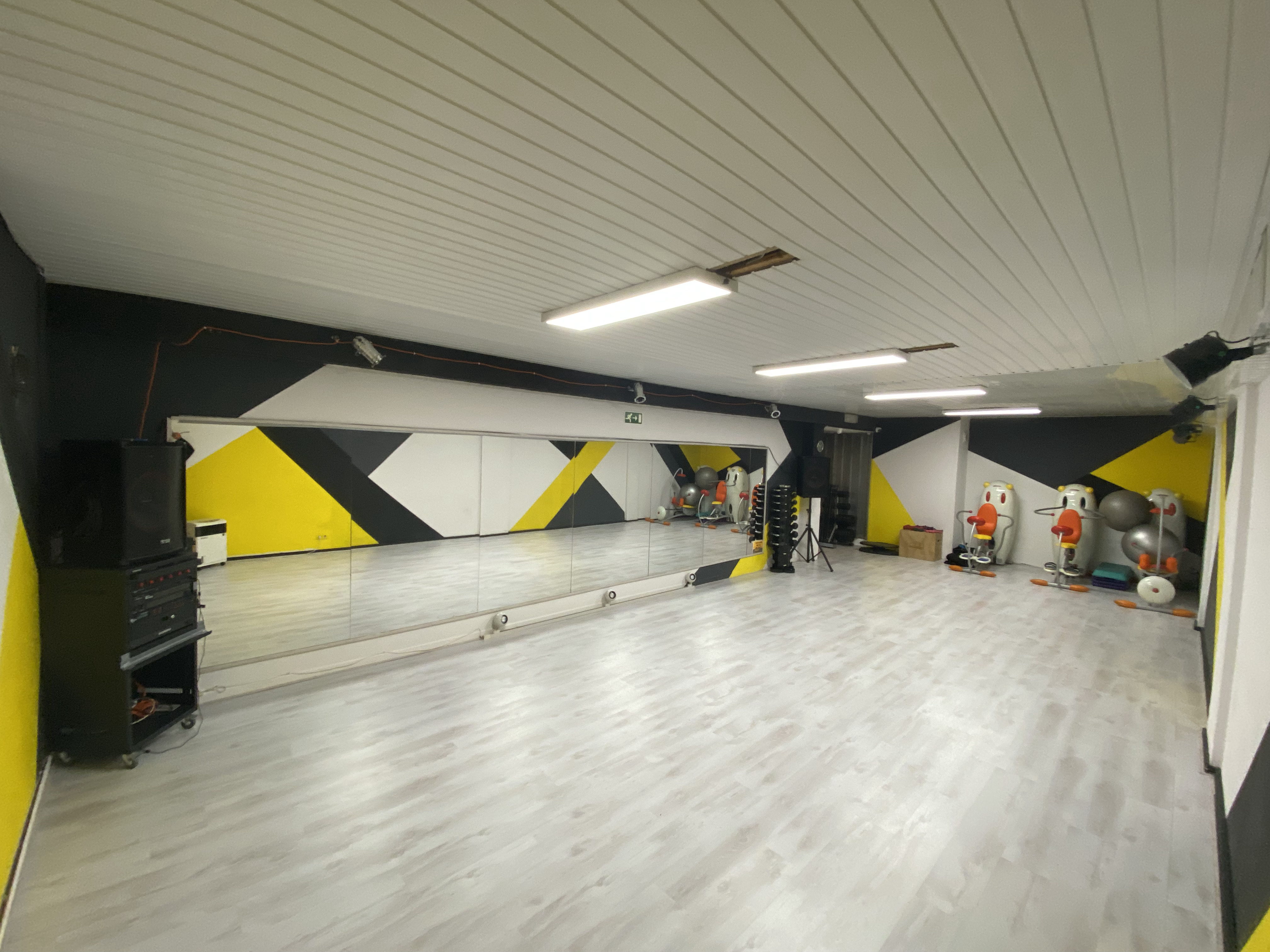 Zaal is aangekleed met laminaatvloer, wandspiegels,verschillende lichtinstallaties en een muziek installatie.