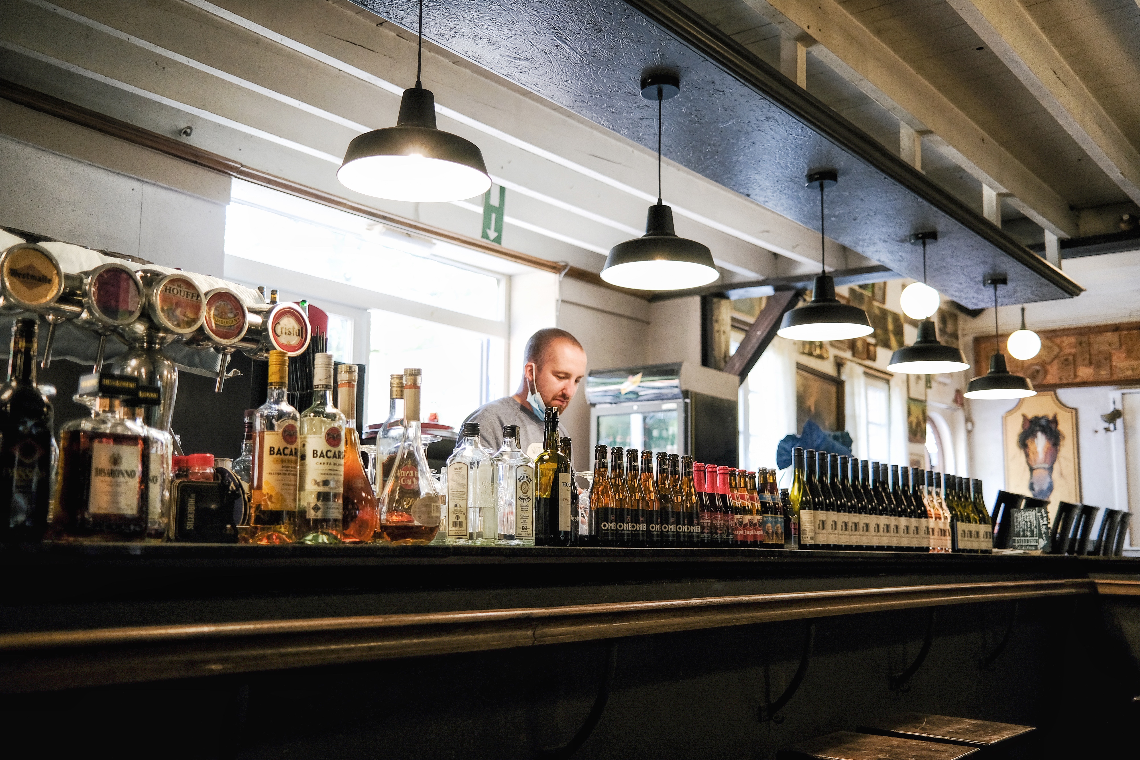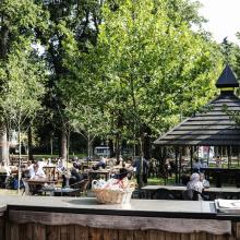 Buitenbar met terras, overdekt en open (150 zitplaatsen) met zicht op weide.