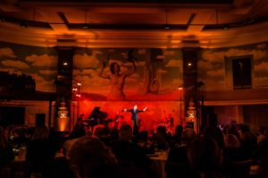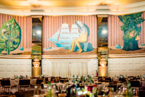 De zaal is versierd met handgeschilderde fresco’s van René Margritte, die refereren naar de bekende panoramische muurschildering “Het Betoverde Rijk” uit 1953. Wij zijn dan ook bijzonder fier dat we deze zaal ter beschikking kunnen stellen van onze gasten.